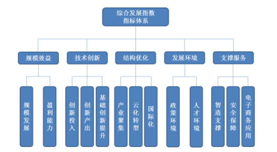 2019年综合发展指数指标体系设置5个一级指标、13个二级指标(见图1),数据基础以我部统计的2018年软件和信息技术服务业统计年报数据为主。