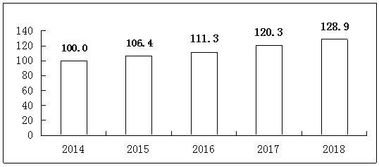 全国综合发展指数采用定基法,选取2014年为基期,设定2014年综合发展指数为100,通过纵向比较,反映全国软件业年度综合变化情况与发展趋势(见图2)。