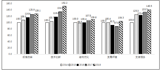 其中,一级指标中技术创新指数与发展环境指数提升最快,分别达到152.2和104.3,上升幅度为17.9个和16.5个分值,对全国综合发展指数上升的贡献率达52.6%和23.3%,拉动作用突出,其他三个指标也实现稳步提升(见表1)。