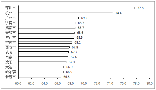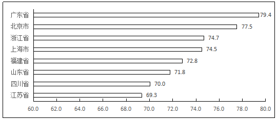 领先省份 | 广东省、北京市、江苏省、浙江省、山东省、上海市、四川省、福建省 | 73.8 |