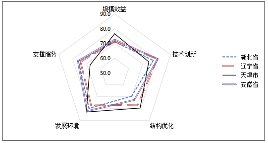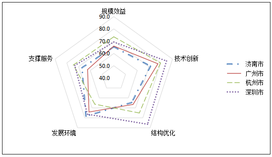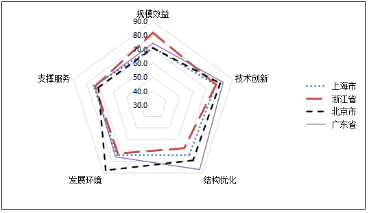 本年领先省份综合发展指数均值为73.8,比上年上升2.5个分值,技术创新指数增长突出,广东省综合得分最高;中间省份综合发展指数均值73.5,比上年上升3.4个分值,规模发展指数增长较快,安徽省综合得分最高;潜力省份综合发展指数均值65.0,发展环境指数增幅相对较快,山西省综合得分最高;重点城市综合发展指数均值69.0,比上年提高0.8个分值,支撑服务指数增幅突出,深圳市综合得分最高。