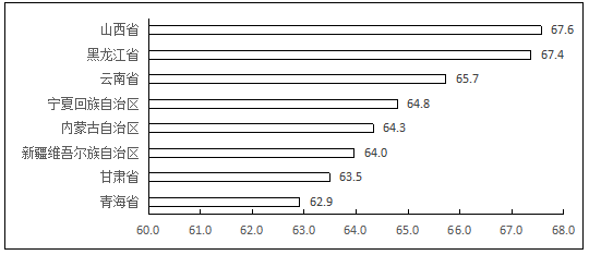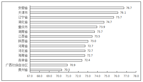 中间省份 | 陕西省、湖北省、天津市、辽宁省、重庆市、吉林省、湖南省、安徽省、河南省、河北省、海南省、贵州省、江西省、广西壮族自治区 | 73.5 |