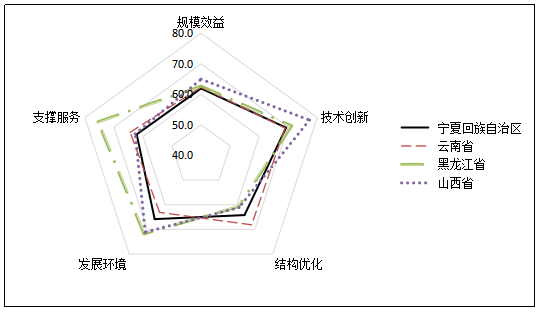 三是潜力省份产业发展环境持续优化,跨越式发展进程加快。潜力省份综合发展指数均值65.0,其中发展环境指数增幅相对较快,比上年提高0.7个分值。黑龙江省发展环境指数居首位,比潜力省份平均水平高5.6个分值,相继出台产业促进政策,持续推进落实鼓励软件业发展的相关政策,全年软件企业享受优惠政策已退税额占应交税额比重为22.4%,比上年提高6.1个百分点,高于潜力省份平均水平13.3个百分点。山西省综合发展指数最高,为67.6,其中技术创新指数优势突出,高出潜力省份平均水平8.5个分值,全年研发强度达9.7%,比上年提高0.5个百分点,企均软件著作权数量居于潜力省份首位。云南省、宁夏回族自治区结构优化指数居于前列,云南省作为潜力省份中唯一有软件百家企业的省市,大企业带动作用凸显,软件百家企业收入占比高达22.0%;宁夏回族自治区紧抓“一带一路”发展机遇,加快推动中卫云基地建设进程,促进产业转型升级,全年云化运营收入占比高达21.4%,比潜力省份平均水平高15.6个百分点。