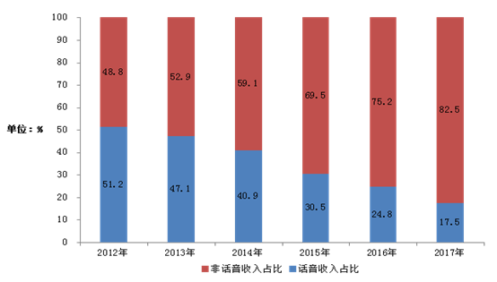 图1-5 2012-2017年电信收入结构(话音和非话音)情况