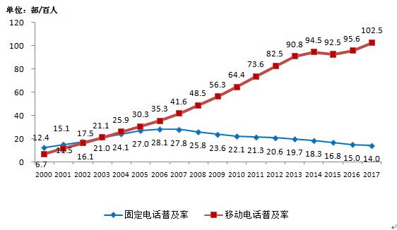 图2-1 2000-2017年固定电话、移动电话用户发展情况