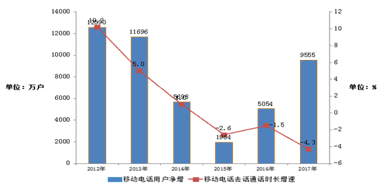 图3-3 2012-2017年移动电话去话通话时长增速和移动用户净增情况
