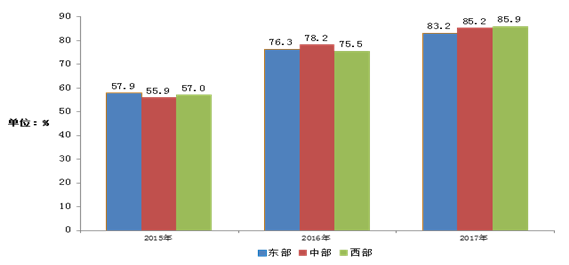 、图5-2 2015-2017年东、中、西部地区光纤宽带接入用户渗透率