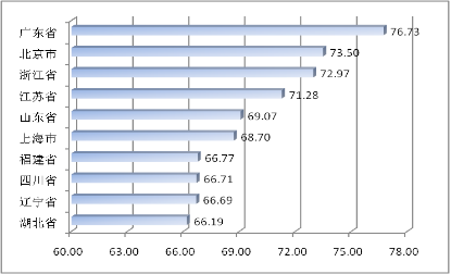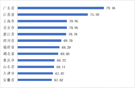 2016年,分地区电子信息制造业综合发展指数最高79.16,最低62.31,平均67.34,均值以上省市12个。广东、江苏、上海、北京、浙江连续三年处于前五名之内,且均位于东部地区。四川省提升十一名,跃居第六位,安徽省提升两名,位居十二位。