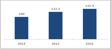 2016年,我国软件和信息技术服务业综合发展指数135.9,比2015年提升13.6,同比增长11.1%,实现“十三五”良好开局。