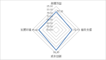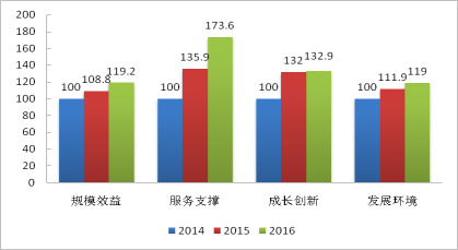 2016年度,我国软件和信息技术服务业综合发展指数四个一级指标均呈上升态势,其中服务支撑指标增幅最为突出,增幅达27.7%,软件业对社会经济服务支撑作用明显提升;规模效益、成长创新和发展环境三个指标有不同程度提升,增长幅度分别为9.6%、0.68%和6.3%。