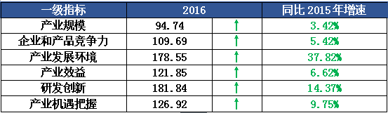 2016年度,我国电子信息制造业综合发展指数六个一级指标均有所上升,其中产业发展环境、研发创新和产业机遇把握三个指标表现突出,指标增幅分别达37.8%、14.4%和9.8%;产业规模、企业和产品竞争力、产业效益三个指标略有提升,增幅分别为3.4%、5.4%和6.6%。