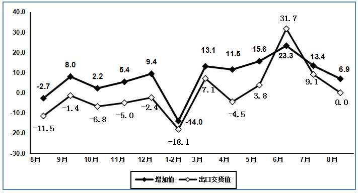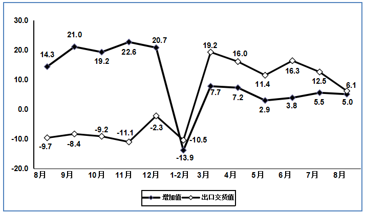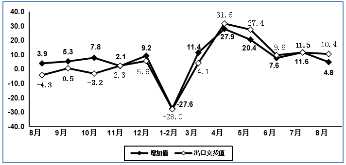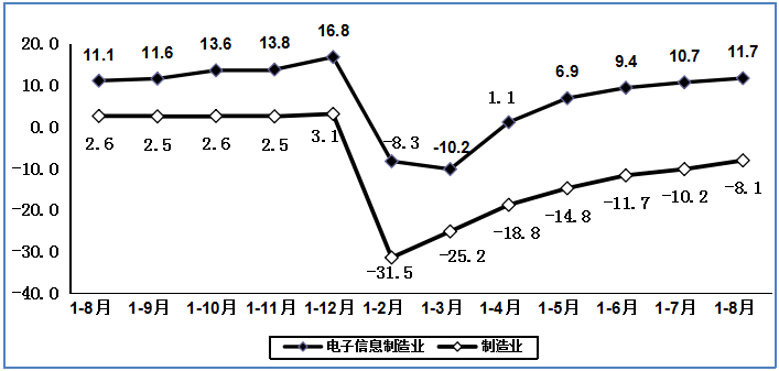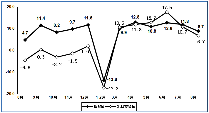 图1 2020年8月电子信息制造业增加值和出口交货值分月增速(%)
