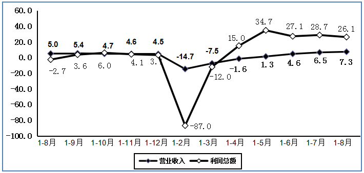 图2 2020年1-8月电子信息制造业营业收入、利润增速变动情况(%)