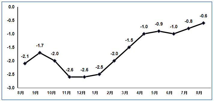 1-8月,电子信息制造业生产者出厂价格同比下降1.3%。8月份,电子信息制造业生产者出厂价格同比下降0.6%,降幅比上月收窄0.2个百分点。