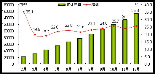 2013年全年,我国手机产量达到14.6亿部,增长23.2%,增速比上年提高18.9个百分点。据IDC发布的2013年全球手机18亿部的出货量测算,我国产量占全球出货量份额达到81.1%,比2012年提高10个百分点以上,我国全球手机生产制造基地的位置得到进一步稳固。从全年产量走势来看,呈平稳较快增长态势,除三、四月份累计产量增速相对较低以外,其余各月累计产量增速均在20%以上。