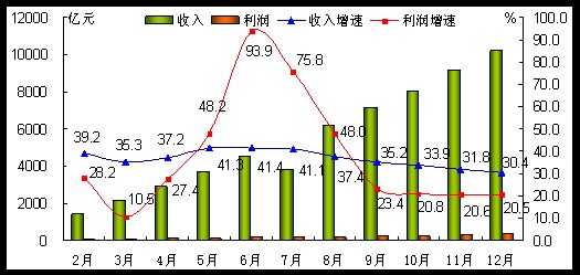 2013年以来,在市场需求快速增长拉动下,我国通信终端设备制造业经济效益保持较快增长。1-12月,行业共实现主营业务收入10233亿元,同比增长30.4%;实现利润总额355亿元,同比增长20.5%;行业收入增速高于电子制造业平均水平20.0个百分点;行业平均利润率达到3.5%,低于电子制造业平均水平1.0个百分点,效益质量还有待提升。