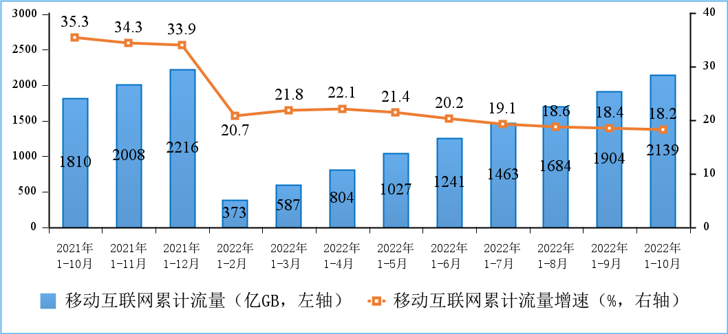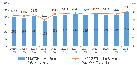 移动互联网流量较快增长,当月DOU值创新高。1—10月份,移动互联网累计流量达2139亿GB,同比增长18.2%。截至10月末,移动互联网用户数达14.62亿户,比上年末净增4637万户。10月当月户均移动互联网接入流量(DOU)达到16.12GB/户·月,同比增长12.5%,比上年底高1.4GB/户·月。