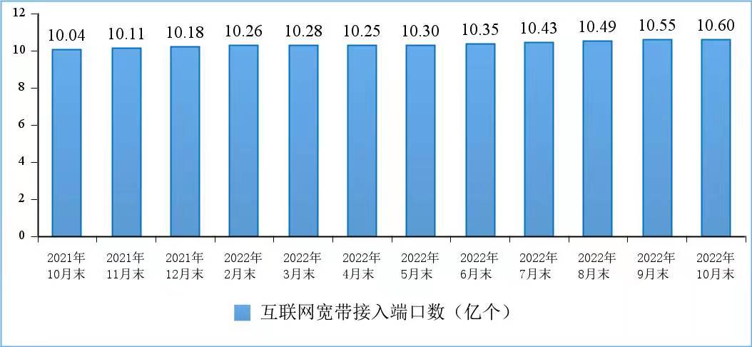 千兆网络服务能力持续提升。截至10月末,全国互联网宽带接入端口数量达10.6亿个,比上年末净增4193万个。其中,光纤接入(FTTH/O)端口达到10.13亿个,比上年末净增5288万个,占互联网宽带接入端口的95.6%,占比较上年末提高1.3个百分点。截至10月末,具备千兆网络服务能力的10G PON端口数达1327万个,比上年末净增540.8万个。
