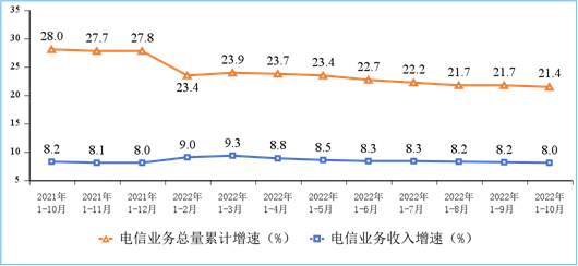 电信业务收入稳步增长,电信业务总量保持两位数增幅。1—10月份,电信业务收入累计完成13215亿元,同比增长8%,按照上年不变价计算的电信业务总量同比增长21.4%。