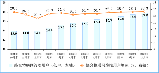 “物超人”步伐持续加大,IPTV用户稳步增长。截至10月末,三家基础电信企业发展蜂窝物联网终端用户17.77亿户,比上年末净增3.79亿户;已超移动电话用户数9482万户,占移动网终端连接数(包括移动电话用户和蜂窝物联网终端用户)的比重已达51.4%。IPTV(网络电视)总用户数达3.74亿户,比上年末净增2532万户。