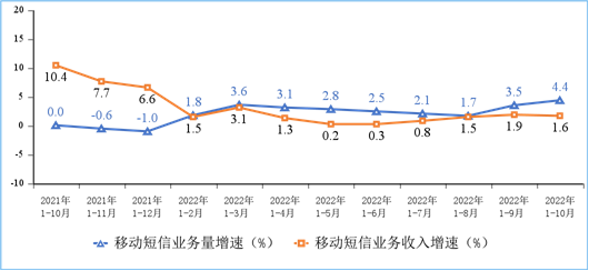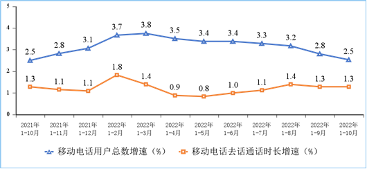 移动电话通话量低速增长,移动短信业务量增速小幅回升。1—10月份,移动电话去话通话时长完成1.91万亿分钟,同比增长1.3%;固定电话主叫通话时长完成696亿分钟,同比下降10.2%。1—10月份,全国移动短信业务量同比增长4.4%,移动短信业务收入同比增长1.6%,增速较前三季度分别提升0.9个和回落0.3个百分点。