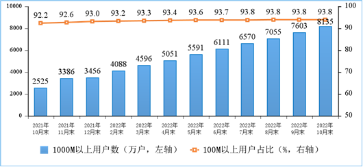 固定宽带接入用户稳步增加,千兆用户数持续扩大。截至10月末,三家基础电信企业的固定互联网宽带接入用户总数达5.83亿户,比上年末净增4745万户。其中,100Mbps及以上接入速率的固定互联网宽带接入用户达5.47亿户,占总用户数的93.8%,占比较上年末提升0.8个百分点;1000Mbps及以上接入速率的固定互联网宽带接入用户达8135万户,比上年末净增4676万户,占总用户数的13.9%,占比较前三季度提升0.8个百分点。