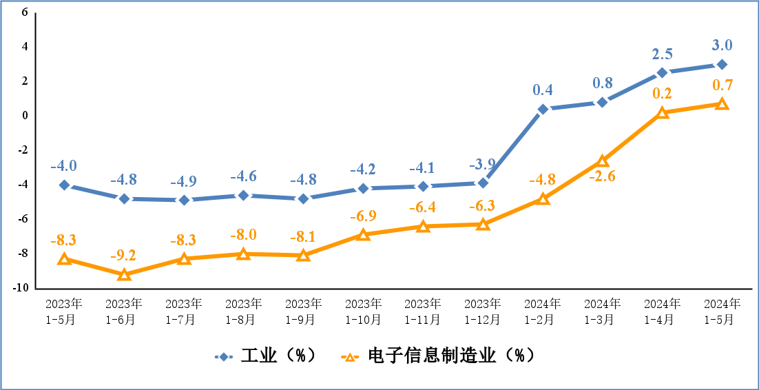 1-5月,我国电子信息制造业生产稳步增长,出口稳定恢复,效益逐月改善,投资增速加快,行业整体增势明显。