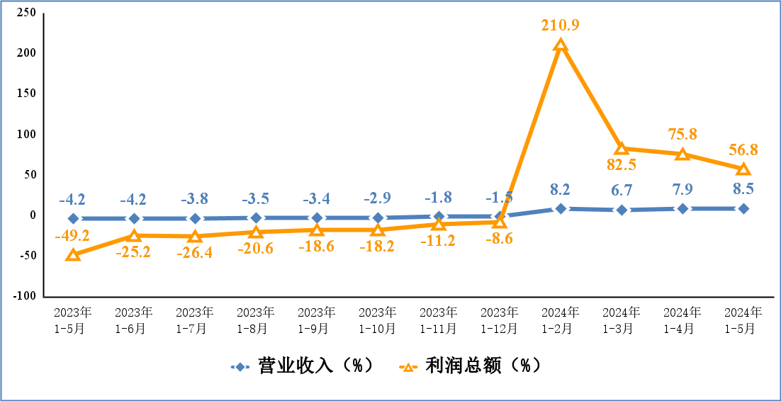 1-5月,规模以上电子信息制造业实现营业收入5.95万亿元,同比增长8.5%,较1-4月提高0.6个百分点;营业成本5.22万亿元,同比增长7.9%;实现利润总额1946亿元,同比增长56.8%;营业收入利润率为3.3%,较1-4月增加0.2个百分点。5月份,规模以上电子信息制造业营业收入1.28万亿元,同比增长10.8%。