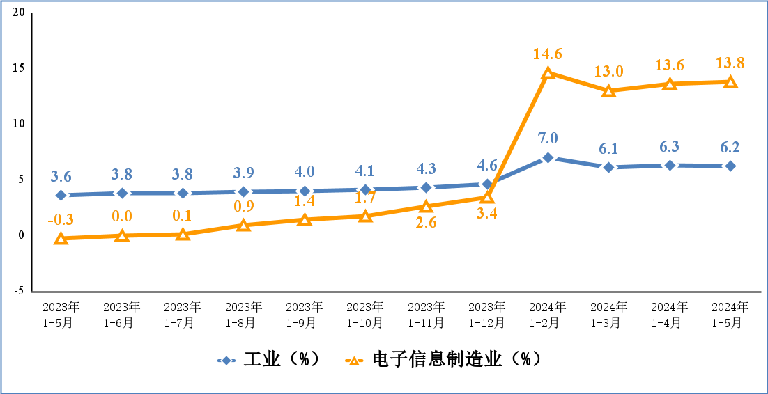 1-5月,规模以上电子信息制造业增加值同比增长13.8%,增速分别比同期工业、高技术制造业高7.6个和5.1个百分点。5月份,规模以上电子信息制造业增加值同比增长14.5%。