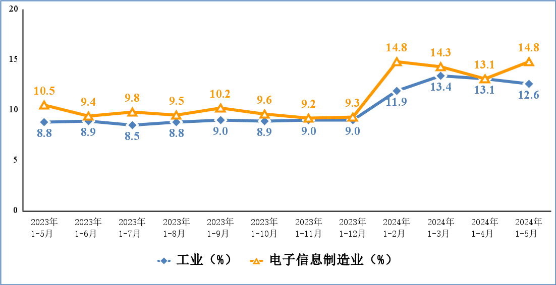1-5月,电子信息制造业固定资产投资同比增长14.8%,较1-4月提高1.7个百分点,比同期工业、高技术制造业投资增速分别高2.2个和4.4百分点。