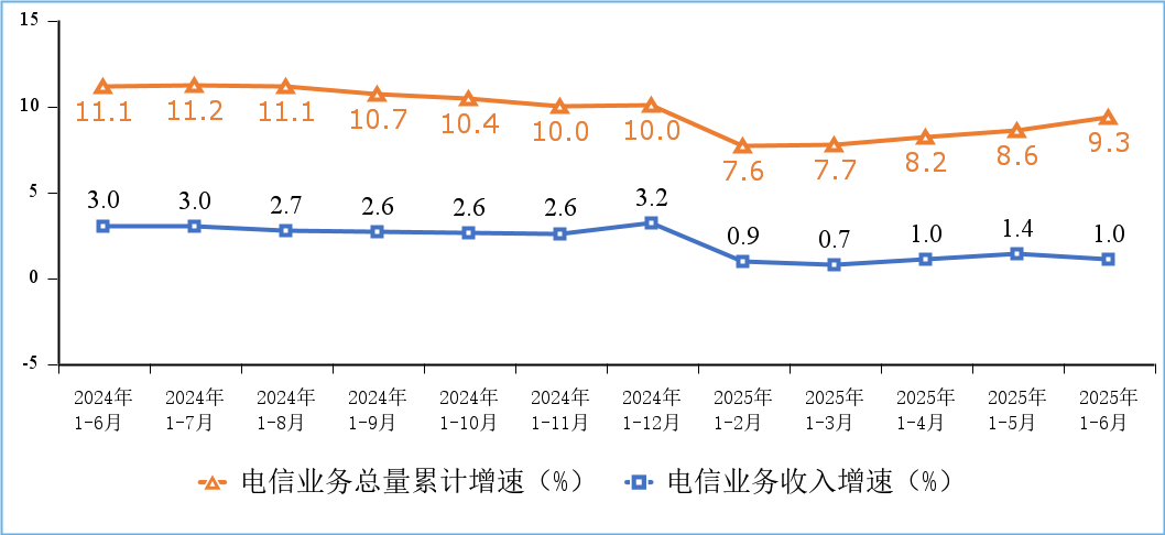 电信业务收入保持正增长,电信业务总量增长较快。上半年,电信业务收入累计完成9055亿元,同比增长1%。按照上年不变价计算的电信业务总量同比增长9.3%。
