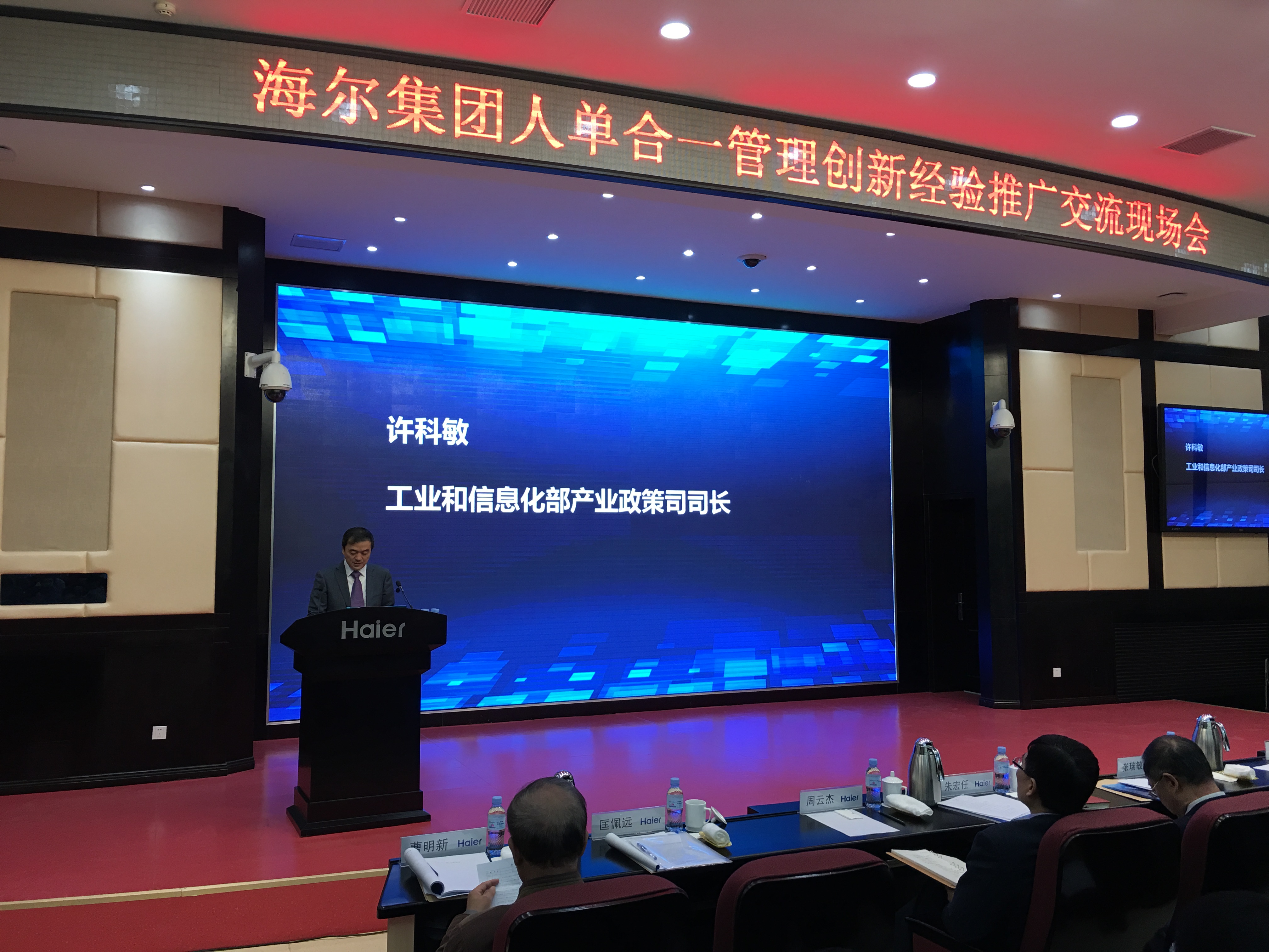 海尔现场交流会以总结推广海尔人单合一管理模式为主题,产业政策司司长许科敏、青岛市经信委主任项阳青、中企联常务副会长朱宏任出席会议并致辞,海尔集团董事局主席张瑞敏作了主旨报告,海尔副总李华刚、雷神科技CEO路凯林等进行了专题讲解,有关专家做了解读。会前,参会代表赴企业生产现场进行了观摩学习。