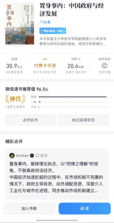 从荐读书目来看,创新篇、管理篇、融资篇、法律篇、转型篇、宏观篇等相关书籍平均推荐值为80.5%。其中,“宏观篇”荐读书籍《置身事内:中国政府与经济发展》阅读人数30.9万,推荐值高达96.5%,在微信读书APP中显示为“神作”;“创新篇”多篇荐读书籍显示为“好评如潮”“脍炙人口”“值得一读”。
