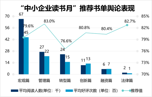 微信读书APP相关数据显示,“中小企业书单”分六批次推荐后,获得读者如潮好评。其中,宏观篇、管理篇、转型篇推荐书目综合排名前三,平均阅读人数分别为6.7万、2.7万、2.4万,平均好评次数(含点赞量、评论量、收藏量)分别为4.5万、2.2万、1.5万。相关数据说明,读者对宏观经济、企业管理及中小企业数字化转型等内容关注度相对较高。