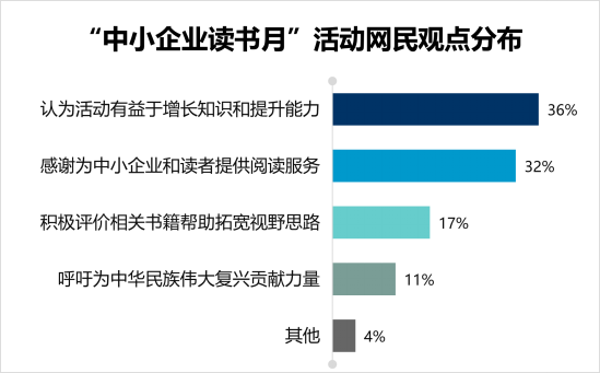 一是认为“读书月”活动有益于增长知识,助力中小企业管理能力水平提升。网民“小灰灰”称,为中小企业管理提供好的服务。网民“王”称,精彩读书声,我们共进步。网民“天哲”称,认真学习长知识而进步。