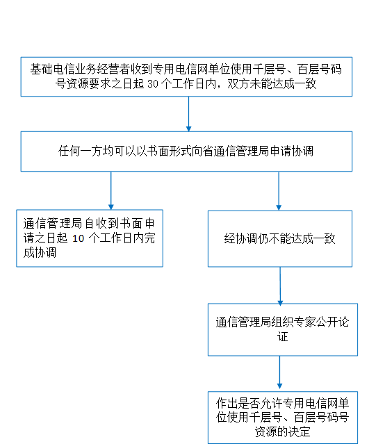 2 | 330802 | 浙江省通信管理局 | 行政裁决 | 专用电信网单位使用千层号、百层号码号资源纠纷裁决 | 《电信网码号资源管理办法》(2003年信息产业部令第28号,2014年工业和信息化部令第28号修正)第十七条第三款:“自基础电信业务经营者收到专用电信网单位的协商要求之日起30个工作日内,双方未能达成一致的,任何一方均可以申请当地省、自治区、直辖市通信管理局协调。省、自治区、直辖市通信管理局应当自收到书面申请之日起10个工作日内完成协调,经协调仍不能达成一致的,省、自治区、直辖市通信管理局组织专家公开论证,并作出是否允许专用电信网单位使用千层号、百层号码号资源的决定。” | 监督电话:0571-88092012 |