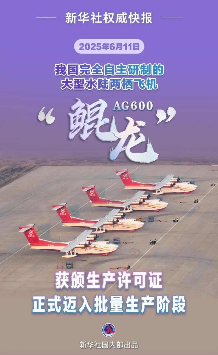 记者从中国航空工业集团有限公司获悉,6月11日,我国完全自主研制的大型水陆两栖飞机AG600“鲲龙”在广东珠海获颁中国民航局生产许可证。这一证件就好比飞机的“出生证”,标志着AG600飞机正式迈入批量生产阶段。