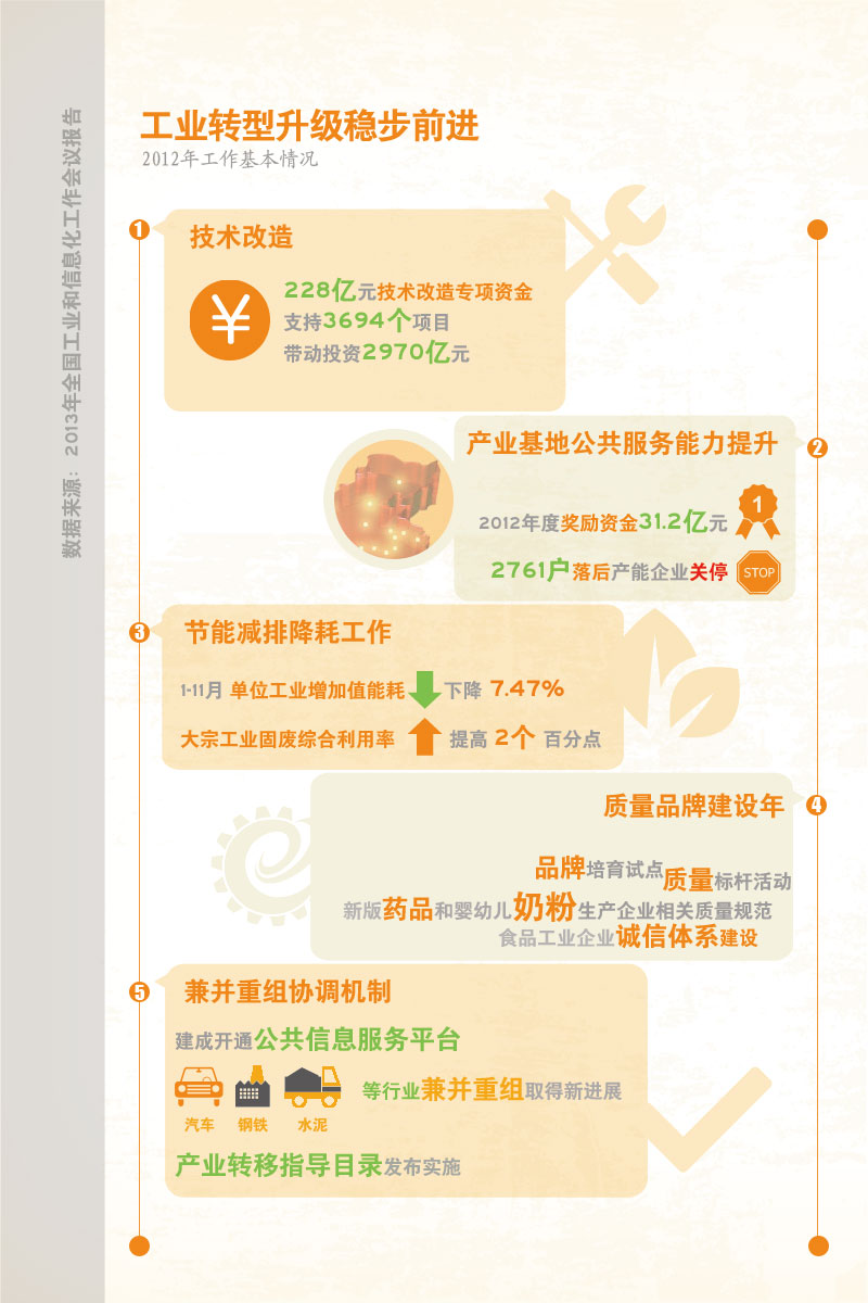 新一代信息技术、高端装备制造、新材料、节能与新能源汽车等规划发布实施,部省在战略性新兴产业重点方向、项目、产品上实现有效对接。国务院关于促进企业技术改造的指导意见发布实施,技术改造长效机制建设迈出重要一步。安排228亿元技术改造专项资金,支持了3694个项目,带动投资2970亿元。产业基地公共服务能力提升工程成效明显。组织对2011年各地淘汰落后产能工作进行了考核,落实了2012年度奖励资金31.2亿元,列入公告的2761户企业的落后产能基本关停。节能减排降耗工作成效明显,1-11月单位工业增加值能耗下降7.47%,大宗工业固废综合利用率提高2个百分点。在国际上率先实施了重型商用车油耗管理。质量品牌建设年活动有序开展,品牌培育试点、质量标杆活动、新版药品和婴幼儿奶粉生产企业相关质量规范稳步实施,食品工业企业诚信体系建设稳步推进。完善了兼并重组协调机制,建成开通公共信息服务平台,汽车、钢铁、水泥等重点行业兼并重组取得新进展。产业转移指导目录发布实施,产业转移有序推进。安全生产指导、稀土专项整治、烟草行业管理取得新成效。