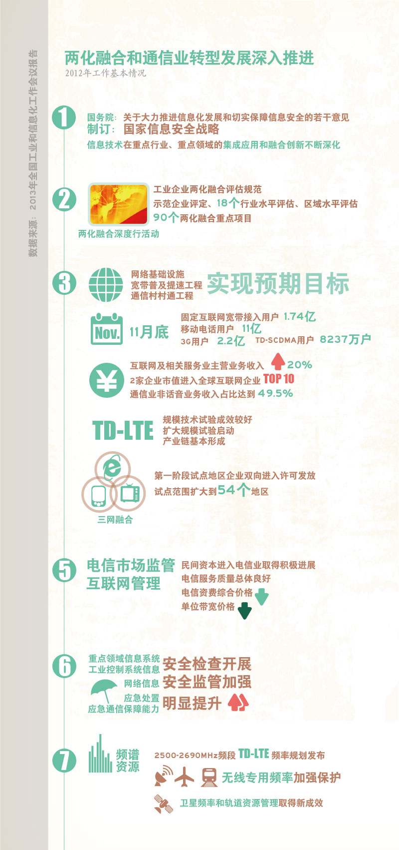 国务院出台了关于大力推进信息化发展和切实保障信息安全的若干意见,国家信息安全战略已制订完成。信息技术在重点行业、重点领域的集成应用和融合创新不断深化。两化融合深度行活动广受关注,工业企业两化融合评估规范基本形成,示范企业评定、18个行业水平评估及区域水平评估有序开展,90个两化融合重点项目顺利推进,两化融合成果展得到社会普遍肯定。网络基础设施建设力度加大,宽带普及提速工程和通信村村通工程实现预期目标。截至11月底,固定互联网宽带接入用户达到1.74亿户,移动电话用户突破11亿户,3G用户达到2.2亿户,其中TD-SCDMA用户8237万户。互联网及相关服务业主营业务收入增长20%,2家企业市值进入全球互联网企业前10名。通信业非话音业务收入占比达到49.5%。TD-LTE规模技术试验取得较好成效,扩大规模试验启动,TD-LTE产业链基本形成。三网融合第一阶段试点地区企业双向进入许可发放,试点范围扩大到54个地区(城市)。电信市场监管和互联网管理进一步加强。民间资本进入电信业取得积极进展。电信服务质量总体良好。电信资费综合价格水平持续下降,单位带宽价格下降尤为明显。重点领域信息系统和工业控制系统信息安全检查扎实开展。网络信息安全监管有效加强,技术手段建设成效显著,应急处置和应急通信保障能力明显提升,圆满完成了重大活动通信和网络信息安全保障任务。科学有效配置频谱资源,2500-2690MHz频段TD-LTE频率规划发布,无线电台站核查、航空铁路等无线电专用频率保护得到加强,卫星频率和轨道资源管理取得新成效。
