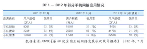 随着移动通信技术的发展和智能手机的普及,移动互联网应用不断推陈出新。手机即时通信工具功能不断增强,能实现集声音、文字、图像、视频的低成本高效率的通信服务,并与社交应用完美融合。手机视频、手机搜索、手机微博等应用快速普及。互联网产业不断催生新兴业态,移动云服务备受推崇。2013年,移动搜索将向智能化、语音化发展;跨平台、跨网络、跨终端的即时通信将加快普及;高清网络视频将成为移动视频行业发展的方向;社交、评论、购物网站将紧密结合,并向“社交+本地+移动”的模式演化。移动金融云、电子商务云、物流云等行业云将迅速发展,面向个人的移动云存储、移动云音乐具有巨大的市场前景。