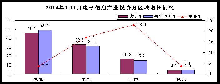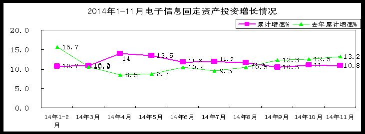 今年前11个月,电子信息产业固定资产投资持续处于低速增长态势,平均增速10%左右,三季度以来持续3个月增速低于去年同期;主要行业如电子元器件、通信设备等行业投资增速持续放缓,家用视听、计算机等行业增速始终低于10%;新开工项目虽有所回升,但回升幅度不大;外商投资低迷,内资企业投资有所回落。主要特点如下: