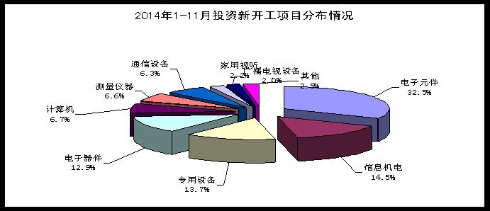 1-11月,电子信息产业新开工项目7564个,同比增长1%,出现今年3月以来的首次正增长,但仍低于去年同期5.7个百分点。其中,通信设备、电子元件行业新开工项目继续下滑,降幅分别为-1.0 %和-2.4 %,但降幅比1-10月收窄2.1 和2.6个百分点;电子器件新开工项目转负为正,同比增长1.7 %;计算机、电子专用设备、信息机电行业新开工项目分别增长2.4 %、4.1 %和6.0 %。