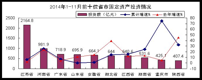 1-11月,西部地区完成投资1838.7 亿元,同比增长23.0 %,增速与1-10月持平,低于去年同期8.7个百分点,其中重庆和陕西分别增长74.6 %和32.1 %。东部地区完成投资5025.7 亿元,同比增长3.7 %,低于全国平均水平7.1个百分点,占全国比重46.1 %,同比下降3.1个百分点,其中北京、天津、上海三市投资继续负增长,江苏、广东、浙江、山东等省投资增速持续放缓。中部地区完成投资3581.2 亿元,同比增长17.1 %,增速比1-10月回落2.3个百分点,其中河南、湖南两省投资同比增长25.2 %和24.2 %,高于全国平均水平14.4和13.4个百分点。东北三省完成投资458.5 亿元,同比增长3.8 %,增速低于去年同期6.6个百分点,比1-10月回落1个百分点。