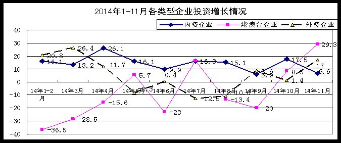 1-11月,外商企业累计完成投资1198.3 亿元,同比增长4.8 %,增速比1-10月回升1.4个百分点,其中外商投资四成多集中于集成电路和光电子器件领域。内资企业完成投资9038.5 亿元,同比增长13.7 %,增速比1-10月回落0.9个百分点,比去年同期低1.8个百分点。其中私营企业和有限责任公司分别完成投资3889.8 和3103.4 亿元,同比增长18.4 %和11.7 %,分别比去年同期下降10.9和0.1个百分点;国有企业完成投资669.9 亿元,同比增长13.2 %,高于去年同期3.3个百分点。港澳台企业投资继续下滑,完成投资667.2 亿元,同比下降10.8%,降幅比1-10月收窄3.4个百分点。