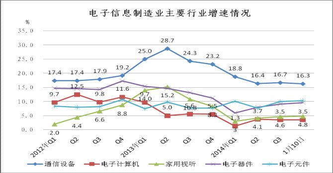 2014年1-10月,我国电子信息产业保持相对较快的增长速度,10月增加值增速在41个工业行业中位居第5位。外需市场持续回暖,一定程度上缓解了内需小幅下滑对行业的下行压力。随着“一带一路”建设的推进,以及双边和多边自由贸易进程的加快,将给我国电子信息产业发展带来更多机遇。