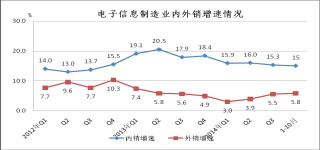 1-10月,规模以上电子信息制造业实现内销产值41432亿元,同比增长15.0%,比1-9月下降0.3个百分点,高出全行业平均增速4.9个百分点;出口交货值41980亿元,同比增长5.8%,比1-9月提高0.3个百分点。其中,内销产值增速比去年年底和去年同期分别低3.4和2.8个百分点;出口交货值增速比去年年底和去年同期分别高0.9和0.2个百分点。