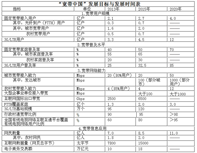 到2020年,基本建成覆盖城乡、服务便捷、高速畅通、技术先进的宽带网络基础设施。固定宽带用户达到4亿户,家庭普及率达到70%,光纤网络覆盖城市家庭。3G/LTE用户超过12亿户,用户普及率达到85%。行政村通宽带比例超过98%,并采用多种技术方式向有条件的自然村延伸。城市和农村家庭宽带接入能力分别达到50Mbps和12Mbps,50%的城市家庭用户达到100Mbps,发达城市部分家庭用户可达1Gbps,LTE基本覆盖城乡。互联网网民规模达到11亿,宽带应用服务水平和应用能力大幅提升。全国有线电视网络互联互通平台覆盖有线电视网络用户比例超过95%。全面突破制约宽带产业发展的高端基础产业瓶颈,宽带技术研发达到国际先进水平,建成结构完善、具有国际竞争力的宽带产业链,形成一批世界领先的创新型企业。