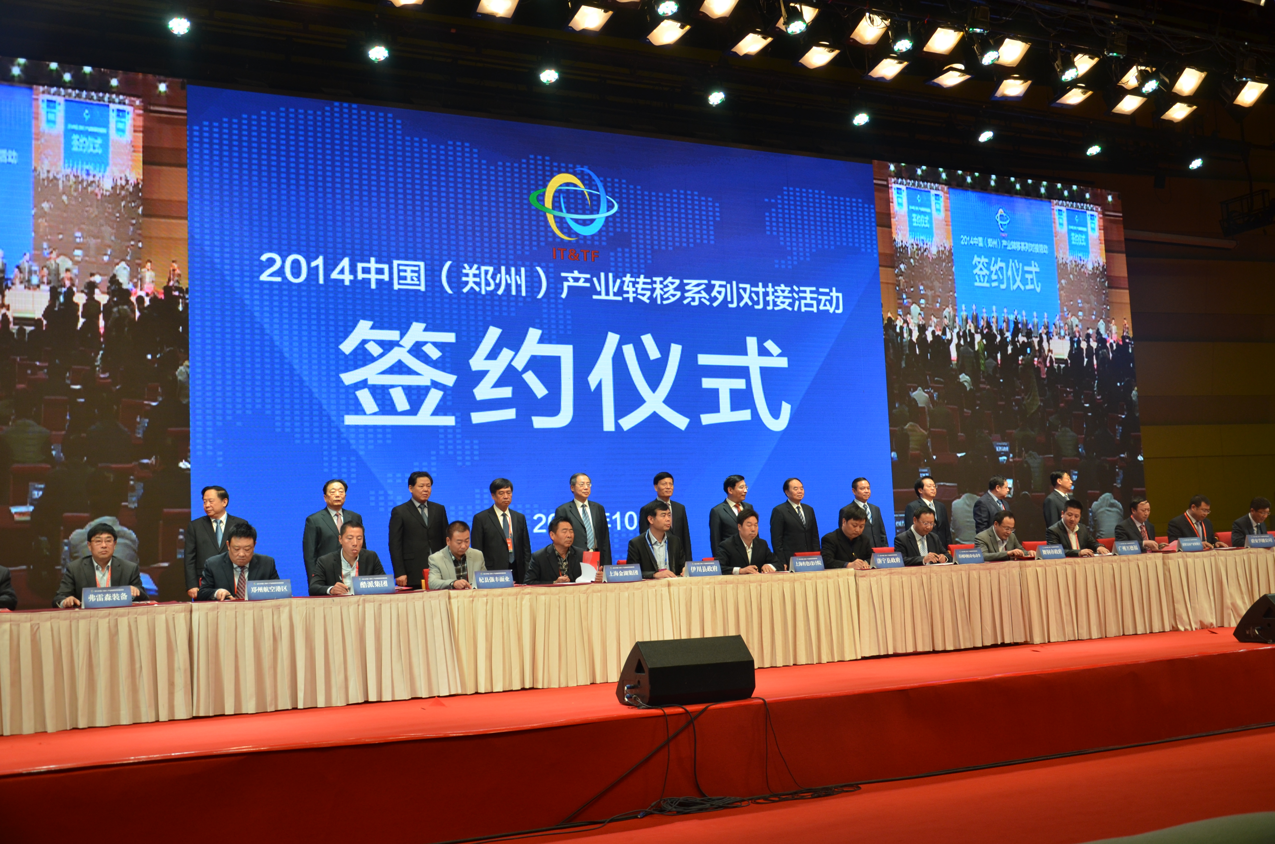 10月31日,由工业和信息化部与河南、河北、山西、内蒙古、安徽、江西、湖北、湖南、陕西9省(区)人民政府共同主办的“2014中国(郑州)产业转移系列对接活动”开幕式暨产业转移系列合作签约仪式在河南郑州隆重举行。