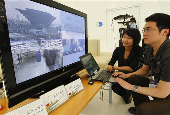 TD-LTE示范网,是我国具有自主知识产权的第四代通信技术标准。图为上海世博园内工作人员通过全球首个TD-LTE宽带移动通信规模演示网查看园区的实时监控画面。