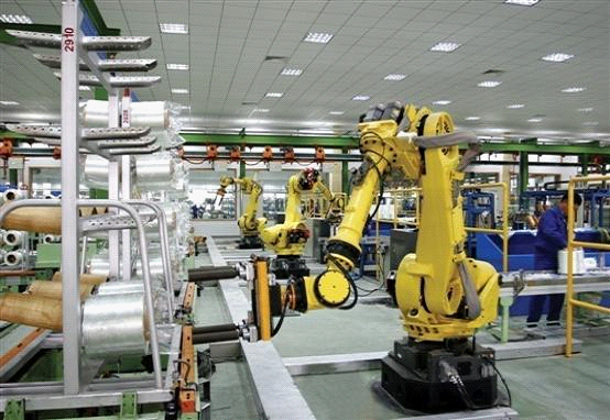 中国建材玻璃纤维池窑拉丝生产线机器人检装车间。